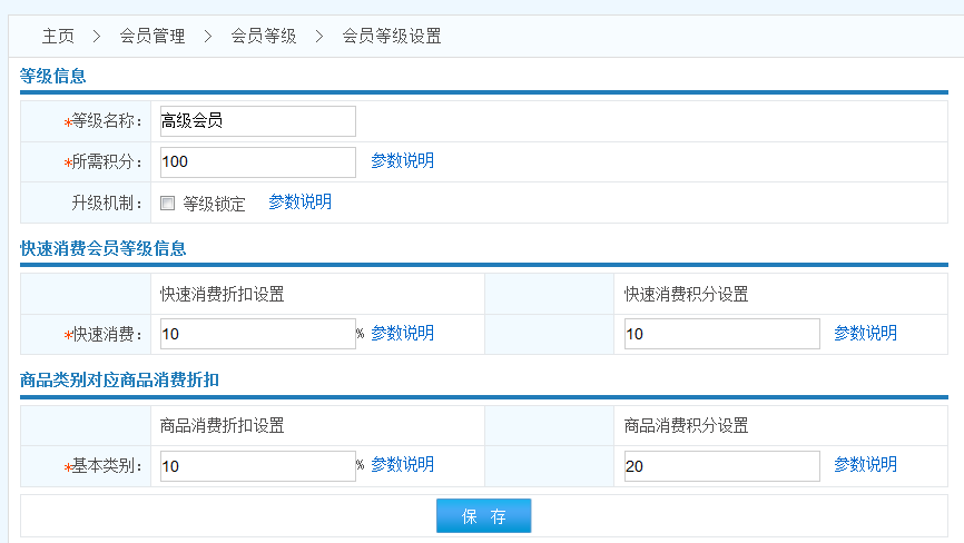 商品類別對應商品消費折扣:基本分類:會員在此等級時,商品消費所能享受的消費折扣 積分:會員在此等級時,商品消費時自動兌換的積分比率,如:消費10元得1積分|消費20元得1積分|消費50元得1積分。