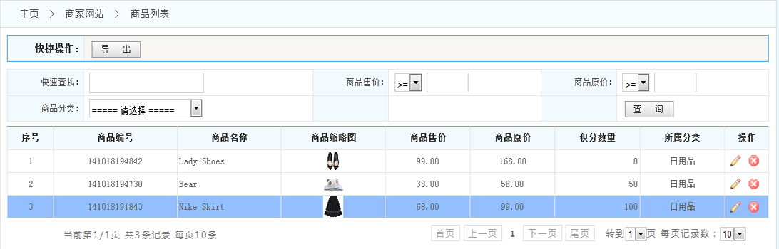 3.列表:在商品列表的操作一欄 可以對該商品進行編輯和刪除