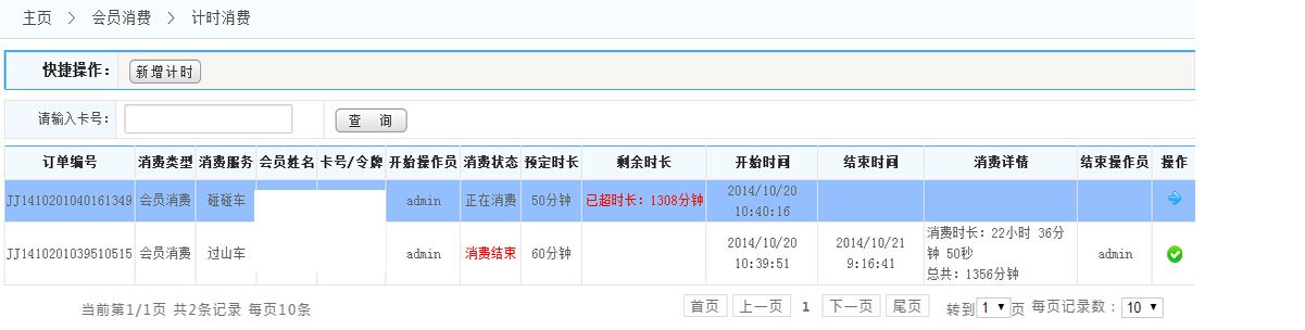 在文本框中輸入會員卡號,可查詢該會員的計時消費記錄