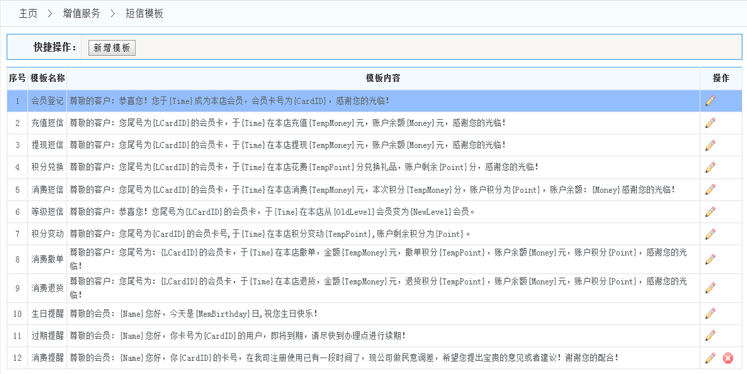 系統(tǒng)模版: 一到十一為系統(tǒng)內(nèi)置模板只可以修改不可以刪除(包含積分變動、等級短信、消費短信、積分兌換、提現(xiàn)短信、充值短信、會員登記;)十二以后為用戶自定義短信模板,可編寫,可刪除